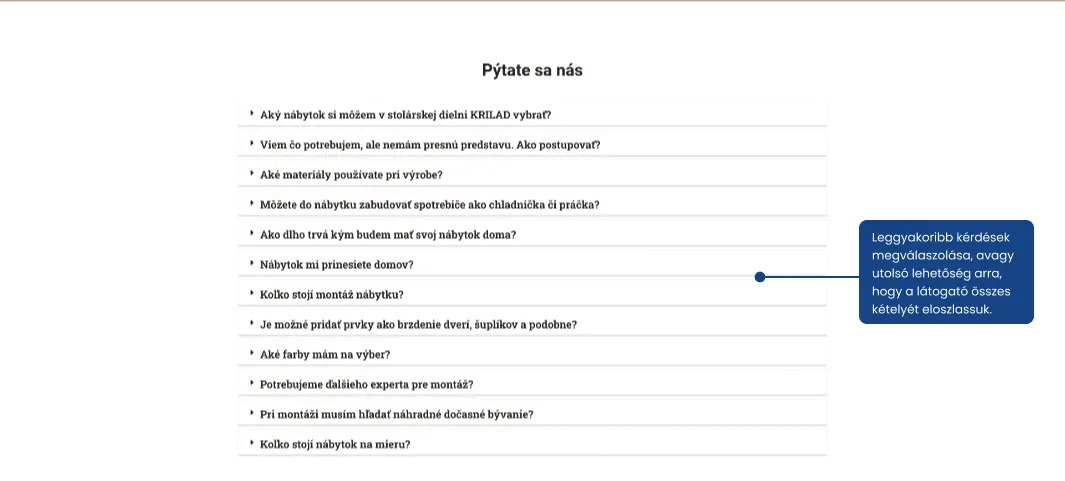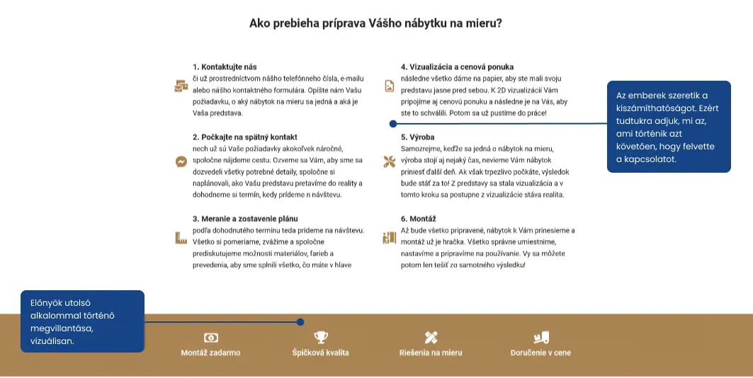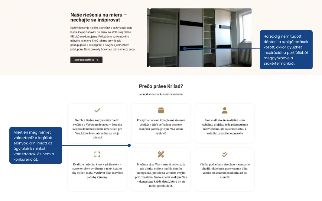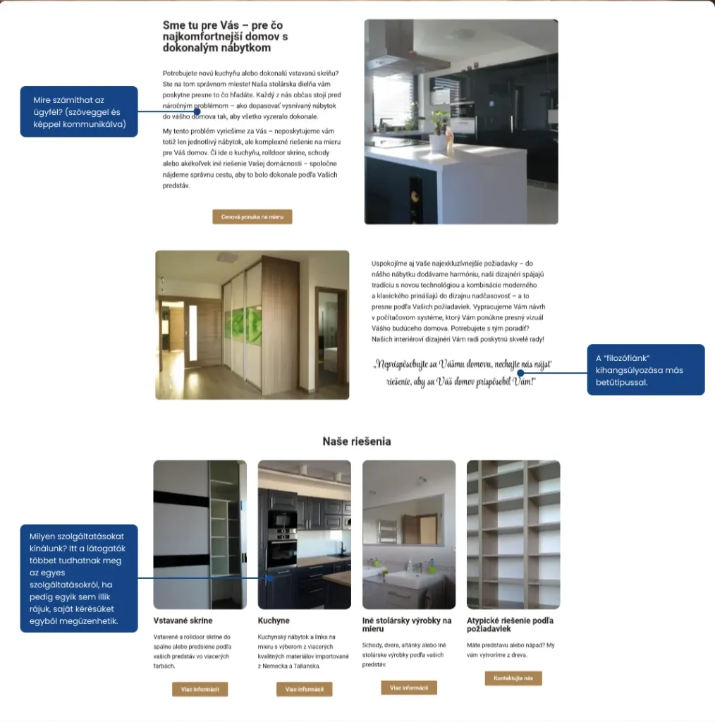 A weboldal új verzióját nulláról építettük fel más grafikai sablon használata nélkül. Kizárólag két dolog maradt meg a régi változatból: a menü és a nyelvválasztó sáv. Minden aloldalnál beazonosítottuk, mi az, amit a látogató meg szeretne tudni az adott termékről. Ezek alapján azok új szövegezést, képeket, interaktív részeket és folyamatábrákat kaptak. Emellett a látogatóknak sokszor kérdéseik voltak az asztalosműhely felé: kell-e fizetni a beszerelésért, nagyjából mennyi idő az elkészítés, milyen színekből válogathatnak vagy milyen anyaggal dolgoznak. Ezért a látogatók legtöbb kérdését is már a weboldalon tisztáztuk.