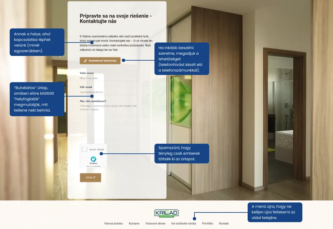 Egy ügyfélszerző weboldalhoz több mindenre kell figyelni: hogy a web gyorsan betöltsön, az eligazodás könnyű legyen, és a látogatónak ne kelljen gondolkodnia. Ha egy mondatot el kell vinni a webdizájnból vagy a marketingből, az ez: ne kelljen gondolkodnia az ügyfélnek. Ehhez pedig az szükséges, hogy alaposan átgondolt folyamatokat, felhasználói felületet alakítsunk ki. Minden elem, ami létezik ugyanazt az egy célt szolgálja. (Ebben az esetben a kapcsolatfelvételt.)
